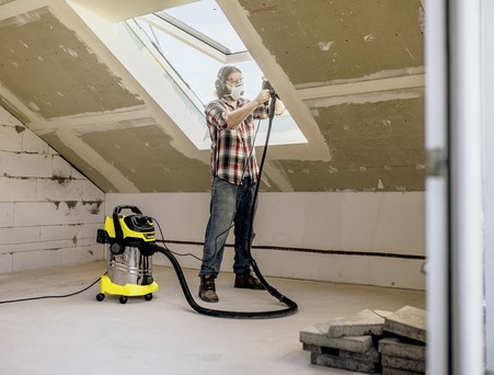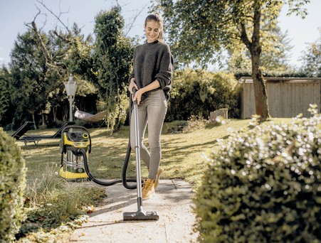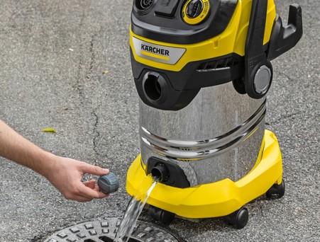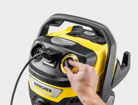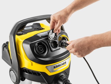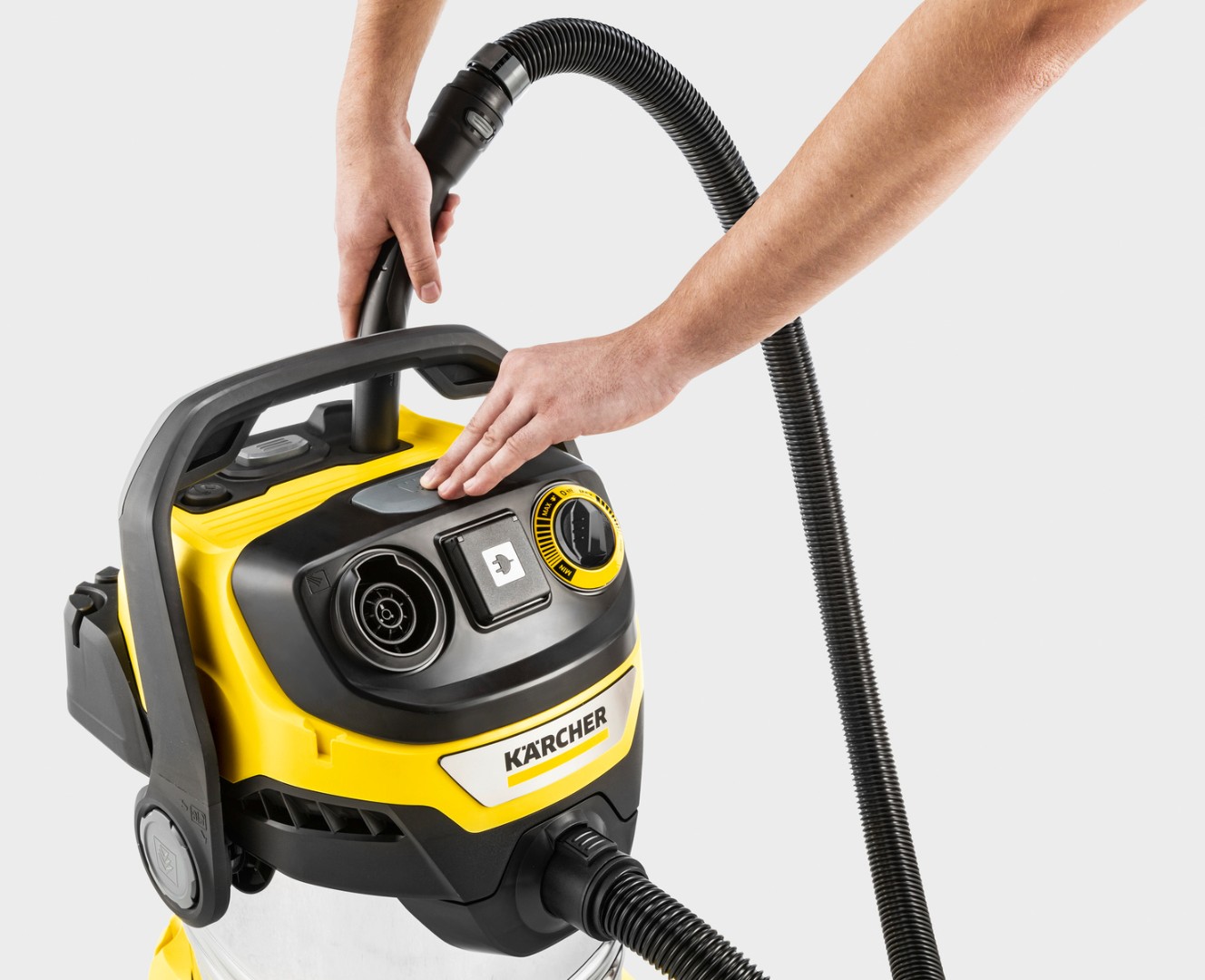 Обладающий колоссальной силой всасывания и энергоэффективный (лишь 1300 Вт потребляемой мощности) хозяйственный пылесос WD 6 P S V-30/6/22/T имеет 6-метровый кабель, всасывающий шланг длиной 2,2 м и 30-литровый мусоросборник из нержавеющей стали, снабженный закрываемым резьбовой пробкой отверстием для удобного слива собираемых жидкостей. Встроенная штепсельная розетка с автоматикой включения / отключения позволяет подключать к нему электроинструменты (лобзики, шлифовальные машины и т. д.) для непосредственного сбора пыли, образующейся при работе с ними. При этом поворотный переключатель обеспечивает регулировку силы всасывания в зависимости от решаемой задачи. Извлечение плоского складчатого фильтра производится очень легко и без контакта с грязью: достаточно лишь отсоединить кассету с ним. При этом эффективная встроенная система очистки фильтра, активируемая нажатием кнопки, обеспечивает восстановление высокой силы всасывания. Для очистки труднодоступных мест и предметов, требующих деликатного обращения, предусмотрена функция выдувания. Съемная рукоятка с защитой от разрядов статического электричества позволяет устанавливать насадки непосредственно на конце всасывающего шланга, что особенно важно при сборе мелкой пыли. Еще одним преимуществом является возможность компактного хранения шланга, подвешиваемого с обеих сторон в верхней части пылесоса, и закрепления насадки для пола вместе со шлангом и удлинительными трубками на время перерывов в работе.