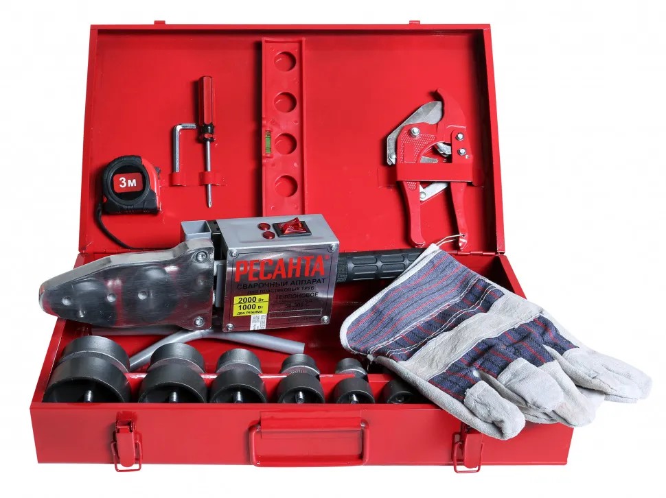 Аппарат для сварки ПВХ труб Ресанта АСПТ-2000 65/55 предназначен для надежного диффузного соединения полипропиленовых труб и фитингов диаметром от 20 до 63 мм.