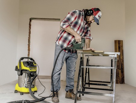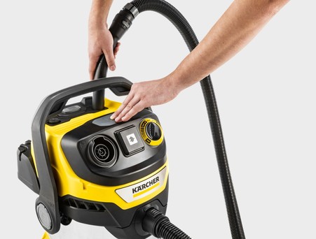 Обладающий колоссальной силой всасывания и энергоэффективный (лишь 1300 Вт потребляемой мощности) хозяйственный пылесос WD 6 P S V-30/6/22/T имеет 6-метровый кабель, всасывающий шланг длиной 2,2 м и 30-литровый мусоросборник из нержавеющей стали, снабженный закрываемым резьбовой пробкой отверстием для удобного слива собираемых жидкостей. Встроенная штепсельная розетка с автоматикой включения / отключения позволяет подключать к нему электроинструменты (лобзики, шлифовальные машины и т. д.) для непосредственного сбора пыли, образующейся при работе с ними. При этом поворотный переключатель обеспечивает регулировку силы всасывания в зависимости от решаемой задачи. Извлечение плоского складчатого фильтра производится очень легко и без контакта с грязью: достаточно лишь отсоединить кассету с ним. При этом эффективная встроенная система очистки фильтра, активируемая нажатием кнопки, обеспечивает восстановление высокой силы всасывания. Для очистки труднодоступных мест и предметов, требующих деликатного обращения, предусмотрена функция выдувания. Съемная рукоятка с защитой от разрядов статического электричества позволяет устанавливать насадки непосредственно на конце всасывающего шланга, что особенно важно при сборе мелкой пыли. Еще одним преимуществом является возможность компактного хранения шланга, подвешиваемого с обеих сторон в верхней части пылесоса, и закрепления насадки для пола вместе со шлангом и удлинительными трубками на время перерывов в работе.